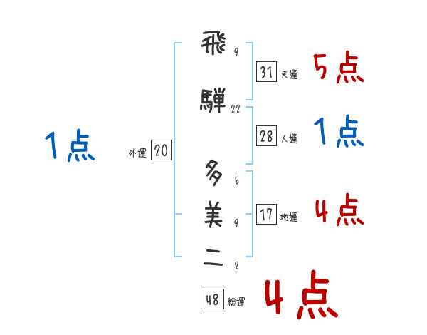 天運![]() | 飛騨多美二さんの天運は31画の5つ星!社交性があり判断力に優れる。順風満帆な人生で円満な生活。 家系が持つ宿命的な運勢を表します。祖先から受け継いだ苗字ですので自分の力が及びません。家柄を象徴します。 |