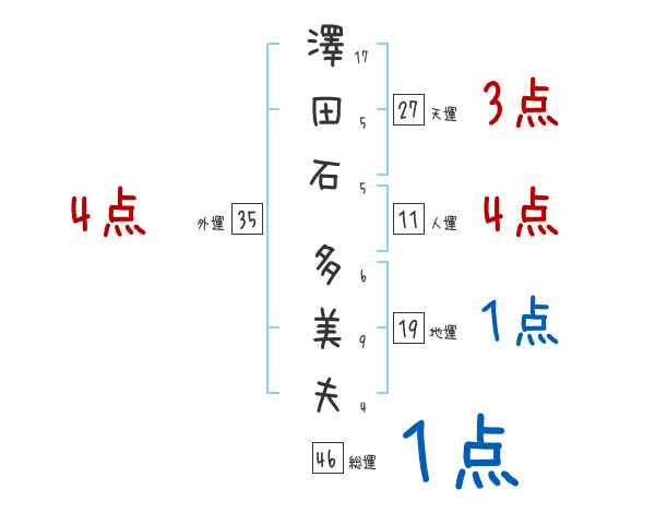外運![]() | 澤田石多美夫さんの外運は35画の4つ星!温厚な性格で感受性が高い。穏和な性格で人望が厚い。 生活面を象徴する運勢です。外部から受ける影響力を表し、結婚運、家庭運や職場、環境への順応性を表します。 |