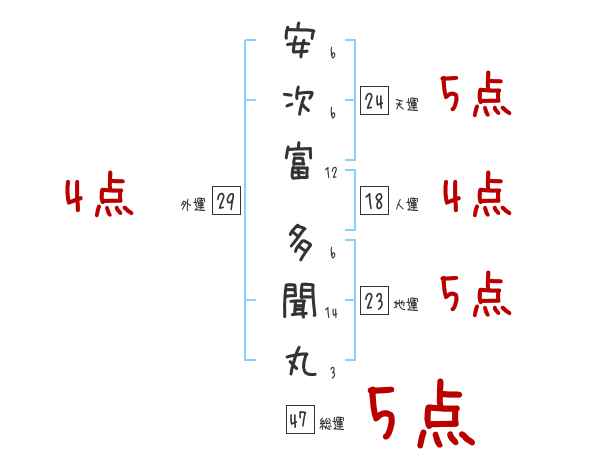 天運![]() | 安次富多聞丸さんの天運は24画の5つ星!家庭運が良く順調な人生。金運にも恵まれる。 家系が持つ宿命的な運勢を表します。祖先から受け継いだ苗字ですので自分の力が及びません。家柄を象徴します。 |