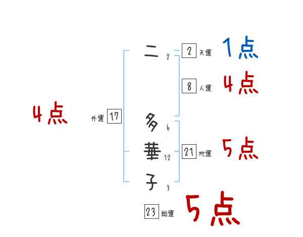 外運![]() | 二多華子さんの外運は17画の4つ星!積極的な行動力。地位を気づき財産を手に入れる。純粋な心と直感力。 生活面を象徴する運勢です。外部から受ける影響力を表し、結婚運、家庭運や職場、環境への順応性を表します。 |