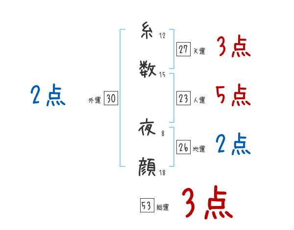 外運![]() | 糸数夜顔さんの外運は30画の2つ星!浮き沈みの激しさに注意しましょう。 生活面を象徴する運勢です。外部から受ける影響力を表し、結婚運、家庭運や職場、環境への順応性を表します。 |