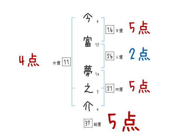 総運![]() | 今富夢之介さんの総運は37画の5つ星!努力家で順応性に優れる。現実的な考え方ができ忠実に物事をこなす。 あなたの人生を表す1番重要な運勢です。生涯を通じて影響する総合運となり、主に50歳以降の晩年期に影響を及ぼします。 |
