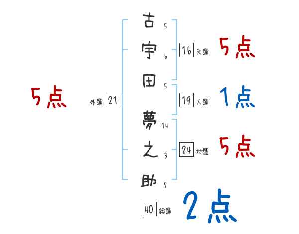 天運![]() | 古宇田夢之助さんの天運は16画の5つ星!人望が厚く大きく発展する。逆転成功が見える。 家系が持つ宿命的な運勢を表します。祖先から受け継いだ苗字ですので自分の力が及びません。家柄を象徴します。 |