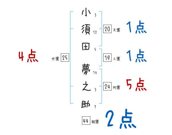 人運![]() | 小須田夢之助さんの人運は19画の1つ星!優れた才能を持ちますが、協調性が足りないことも。周りの人と協力する事を意識しましょう。 性格や才能などを表す2番目に重要な運勢です。人間関係や協調性、社会的な成功に影響します。主に20歳から50歳ぐらいまでの中年期の運勢を表します。 |