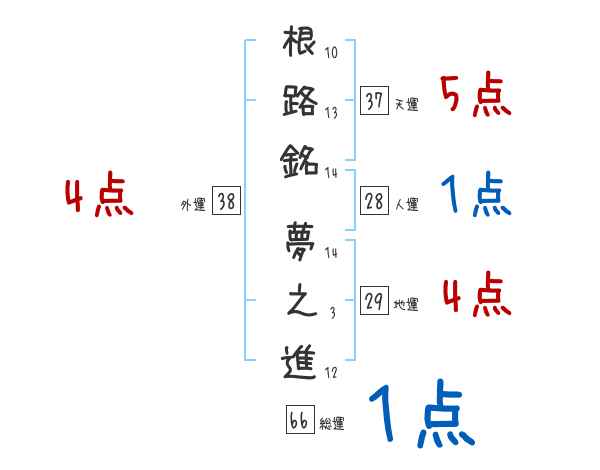 総運![]() | 根路銘夢之進さんの総運は66画の1つ星!迷うことが多く挫折しやすい傾向が。辛抱強く物事に取り組みましょう。 あなたの人生を表す1番重要な運勢です。生涯を通じて影響する総合運となり、主に50歳以降の晩年期に影響を及ぼします。 |