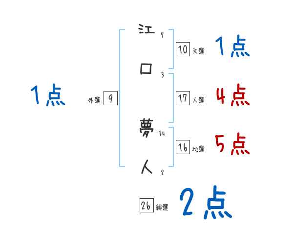 総運![]() | 江口夢人さんの総運は26画の2つ星!波瀾万丈かも。信頼できる人を大事にしましょう。 あなたの人生を表す1番重要な運勢です。生涯を通じて影響する総合運となり、主に50歳以降の晩年期に影響を及ぼします。 |