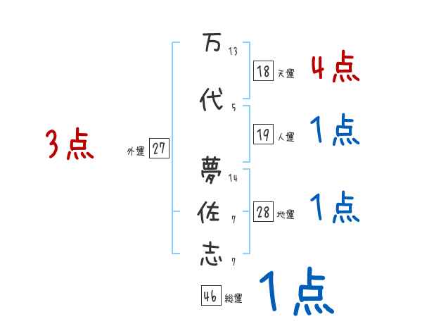 天運![]() | 万代夢佐志さんの天運は18画の4つ星!情熱的で剛気。忍耐力があり信頼される。 家系が持つ宿命的な運勢を表します。祖先から受け継いだ苗字ですので自分の力が及びません。家柄を象徴します。 |