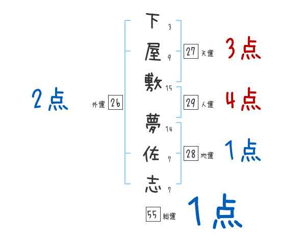 地運![]() | 下屋敷夢佐志さんの地運は28画の1つ星!家庭環境に注意。スポーツで活躍できる能力があるかも。 個性を表す基礎的な運勢です。性格形成や対人関係、行動力など家庭環境に影響されます。主に誕生してから20歳くらいまでの若年期の運勢を表します。 |