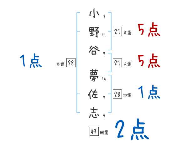 天運![]() | 小野谷夢佐志さんの天運は21画の5つ星!統率力がある。独立し成功する。名誉を手に入れる。 家系が持つ宿命的な運勢を表します。祖先から受け継いだ苗字ですので自分の力が及びません。家柄を象徴します。 |