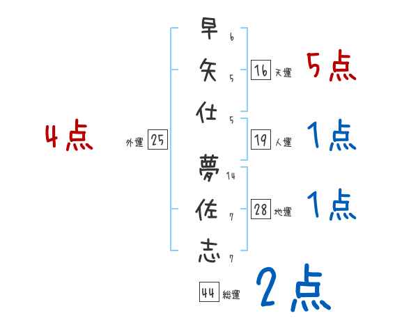 総運![]() | 早矢仕夢佐志さんの総運は44画の2つ星!誠実で慎重な性格。物事を考えすぎないように注意しましょう。 あなたの人生を表す1番重要な運勢です。生涯を通じて影響する総合運となり、主に50歳以降の晩年期に影響を及ぼします。 |