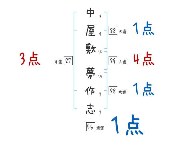 天運![]() | 中屋敷夢作志さんの天運は28画の1つ星!家庭環境に注意。スポーツで活躍できる能力があるかも。 家系が持つ宿命的な運勢を表します。祖先から受け継いだ苗字ですので自分の力が及びません。家柄を象徴します。 |