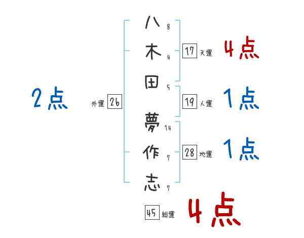 外運![]() | 八木田夢作志さんの外運は26画の2つ星!波瀾万丈かも。信頼できる人を大事にしましょう。 生活面を象徴する運勢です。外部から受ける影響力を表し、結婚運、家庭運や職場、環境への順応性を表します。 |