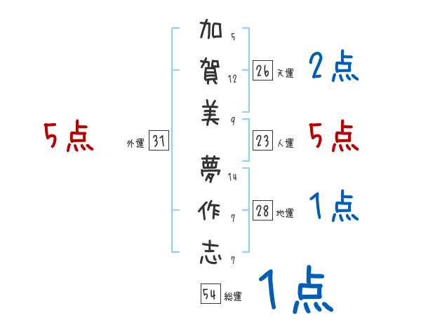 天運![]() | 加賀美夢作志さんの天運は26画の2つ星!波瀾万丈かも。信頼できる人を大事にしましょう。 家系が持つ宿命的な運勢を表します。祖先から受け継いだ苗字ですので自分の力が及びません。家柄を象徴します。 |