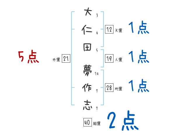地運![]() | 大仁田夢作志さんの地運は28画の1つ星!家庭環境に注意。スポーツで活躍できる能力があるかも。 個性を表す基礎的な運勢です。性格形成や対人関係、行動力など家庭環境に影響されます。主に誕生してから20歳くらいまでの若年期の運勢を表します。 |