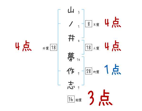 総運![]() | 山ノ井夢作志さんの総運は36画の3つ星!先見性が豊かです。多少神経質で苦労することも。 あなたの人生を表す1番重要な運勢です。生涯を通じて影響する総合運となり、主に50歳以降の晩年期に影響を及ぼします。 |
