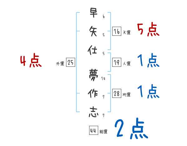 総運![]() | 早矢仕夢作志さんの総運は44画の2つ星!誠実で慎重な性格。物事を考えすぎないように注意しましょう。 あなたの人生を表す1番重要な運勢です。生涯を通じて影響する総合運となり、主に50歳以降の晩年期に影響を及ぼします。 |
