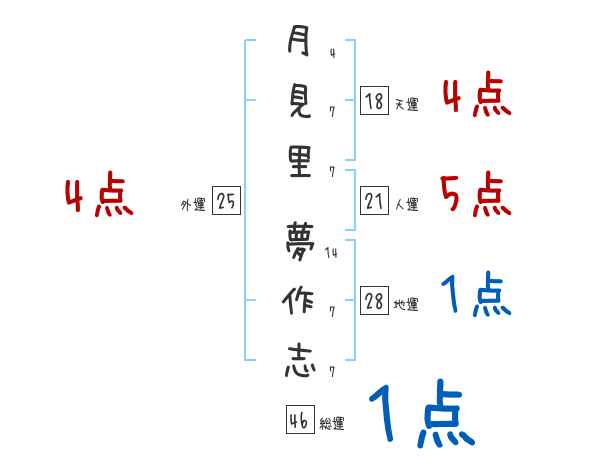 総運![]() | 月見里夢作志さんの総運は46画の1つ星!迷走することが多く苦労するかも。目先のことにとらわれないように。 あなたの人生を表す1番重要な運勢です。生涯を通じて影響する総合運となり、主に50歳以降の晩年期に影響を及ぼします。 |