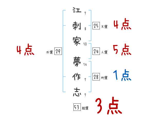 総運![]() | 江刺家夢作志さんの総運は53画の3つ星!やや見栄っ張りで虚栄心がある。散財に注意。 あなたの人生を表す1番重要な運勢です。生涯を通じて影響する総合運となり、主に50歳以降の晩年期に影響を及ぼします。 |
