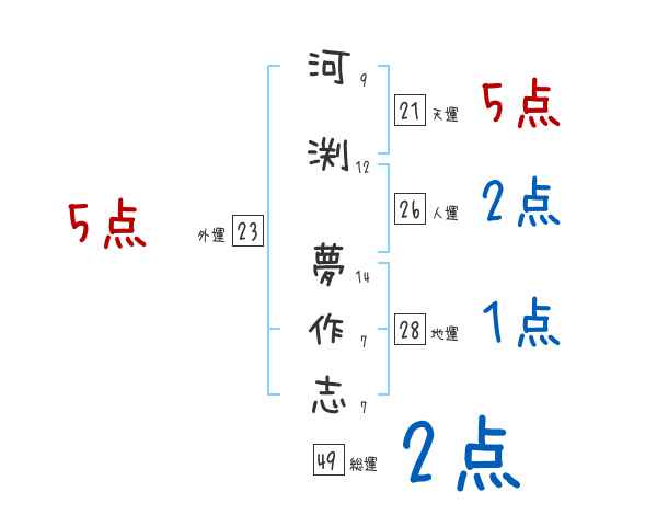 外運![]() | 河渕夢作志さんの外運は23画の5つ星!想像力に優れ活力がある。一代で成功し名誉を手に入れる。 生活面を象徴する運勢です。外部から受ける影響力を表し、結婚運、家庭運や職場、環境への順応性を表します。 |