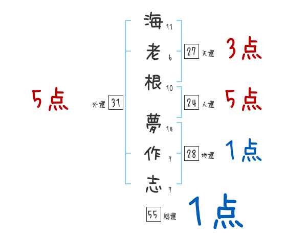 総運![]() | 海老根夢作志さんの総運は55画の1つ星!欲張りな性格で軽率な行動に注意しましょう。病気に気をつけて。 あなたの人生を表す1番重要な運勢です。生涯を通じて影響する総合運となり、主に50歳以降の晩年期に影響を及ぼします。 |