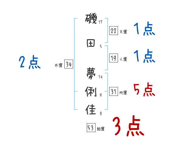 | 総運  | 磯田夢俐佳さんの総運は53画の3つ星!やや見栄っ張りで虚栄心がある。散財に注意。あなたの人生を表す1番重要な運勢です。生涯を通じて影響する総合運となり、主に50歳以降の晩年期に影響を及ぼします。 |
