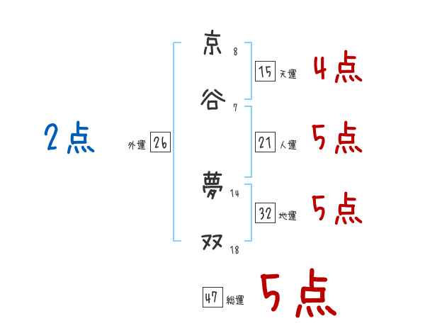 総運![]() | 京谷夢双さんの総運は47画の5つ星!実力が開花し発展する円満な人生。財に恵まれる。 あなたの人生を表す1番重要な運勢です。生涯を通じて影響する総合運となり、主に50歳以降の晩年期に影響を及ぼします。 |