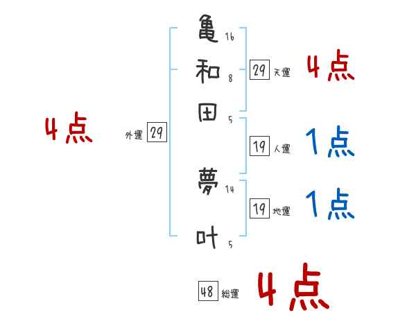 外運![]() | 亀和田夢叶さんの外運は29画の4つ星!完全主義で才能がある。厳格な心の持ち主。 生活面を象徴する運勢です。外部から受ける影響力を表し、結婚運、家庭運や職場、環境への順応性を表します。 |