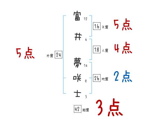 外運![]() | 富井夢咲士さんの外運は24画の5つ星!家庭運が良く順調な人生。金運にも恵まれる。 生活面を象徴する運勢です。外部から受ける影響力を表し、結婚運、家庭運や職場、環境への順応性を表します。 |