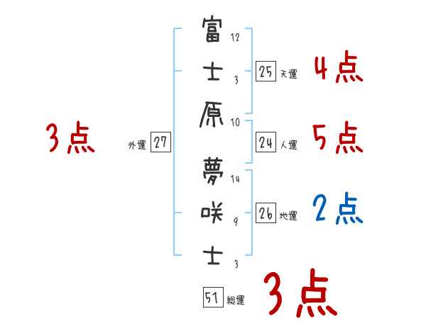 天運![]() | 富士原夢咲士さんの天運は25画の4つ星!個性があり才能があふれる。強運の持ち主で発展する。 家系が持つ宿命的な運勢を表します。祖先から受け継いだ苗字ですので自分の力が及びません。家柄を象徴します。 |