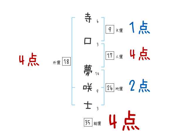 天運![]() | 寺口夢咲士さんの天運は9画の1つ星!消極的で才能を発揮することが苦手なことも。周りの意見に耳を傾けましょう。 家系が持つ宿命的な運勢を表します。祖先から受け継いだ苗字ですので自分の力が及びません。家柄を象徴します。 |