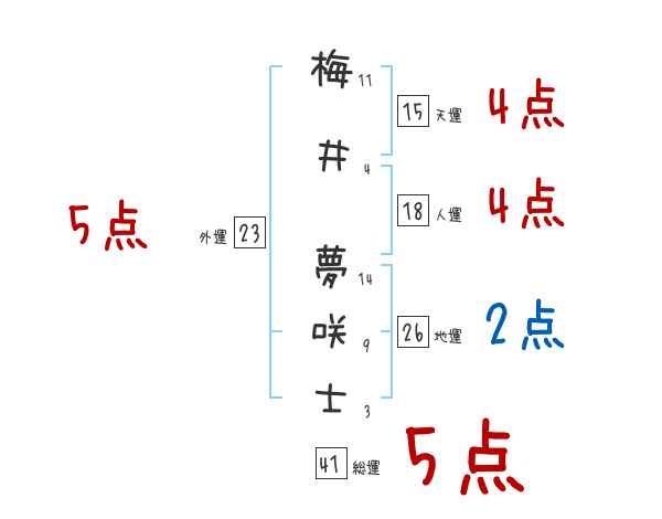 人運![]() | 梅井夢咲士さんの人運は18画の4つ星!情熱的で剛気。忍耐力があり信頼される。 性格や才能などを表す2番目に重要な運勢です。人間関係や協調性、社会的な成功に影響します。主に20歳から50歳ぐらいまでの中年期の運勢を表します。 |
