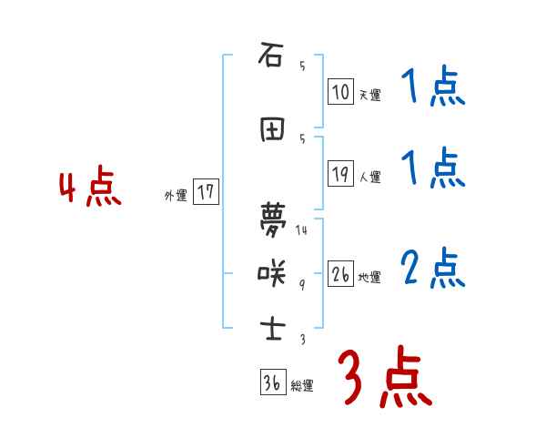 総運![]() | 石田夢咲士さんの総運は36画の3つ星!先見性が豊かです。多少神経質で苦労することも。 あなたの人生を表す1番重要な運勢です。生涯を通じて影響する総合運となり、主に50歳以降の晩年期に影響を及ぼします。 |