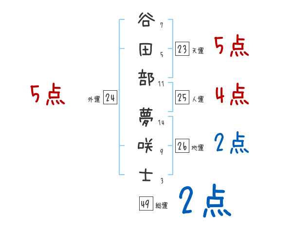 天運![]() | 谷田部夢咲士さんの天運は23画の5つ星!想像力に優れ活力がある。一代で成功し名誉を手に入れる。 家系が持つ宿命的な運勢を表します。祖先から受け継いだ苗字ですので自分の力が及びません。家柄を象徴します。 |