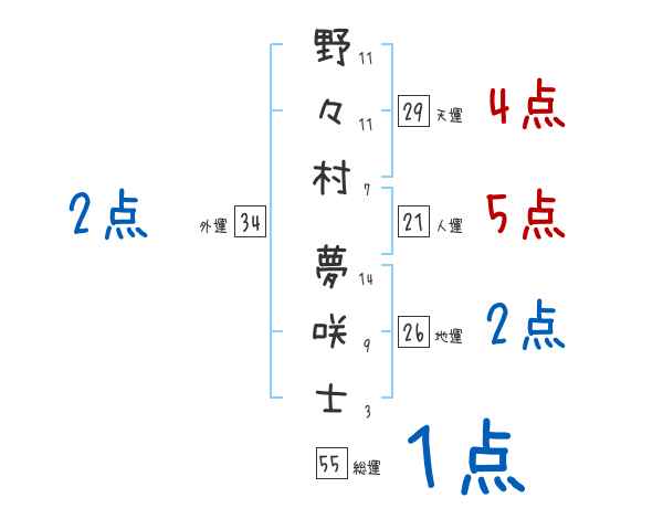 | 人運  | 野々村夢咲士さんの人運は21画の5つ星!統率力がある。独立し成功する。名誉を手に入れる。性格や才能などを表す2番目に重要な運勢です。人間関係や協調性、社会的な成功に影響します。主に20歳から50歳ぐらいまでの中年期の運勢を表します。 |