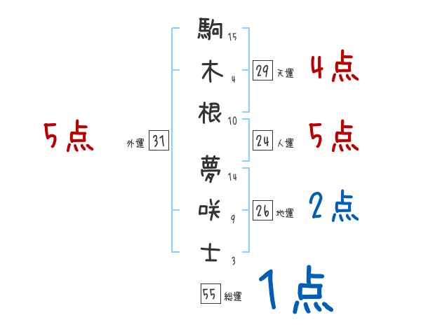 天運![]() | 駒木根夢咲士さんの天運は29画の4つ星!完全主義で才能がある。厳格な心の持ち主。 家系が持つ宿命的な運勢を表します。祖先から受け継いだ苗字ですので自分の力が及びません。家柄を象徴します。 |