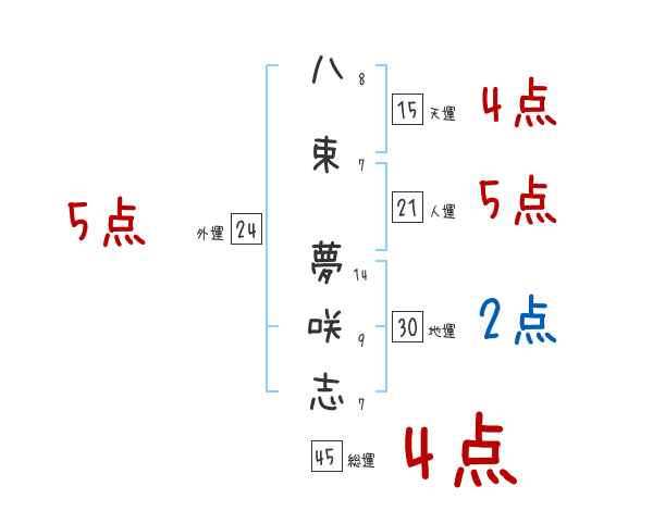 外運![]() | 八束夢咲志さんの外運は24画の5つ星!家庭運が良く順調な人生。金運にも恵まれる。 生活面を象徴する運勢です。外部から受ける影響力を表し、結婚運、家庭運や職場、環境への順応性を表します。 |
