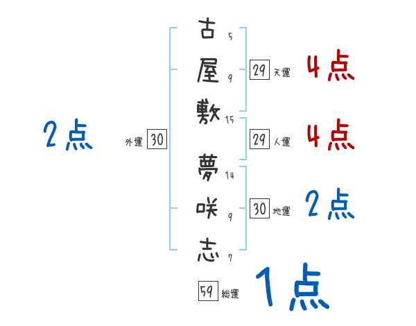 天運![]() | 古屋敷夢咲志さんの天運は29画の4つ星!完全主義で才能がある。厳格な心の持ち主。 家系が持つ宿命的な運勢を表します。祖先から受け継いだ苗字ですので自分の力が及びません。家柄を象徴します。 |