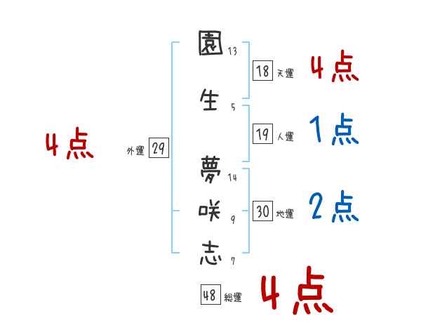 天運![]() | 園生夢咲志さんの天運は18画の4つ星!情熱的で剛気。忍耐力があり信頼される。 家系が持つ宿命的な運勢を表します。祖先から受け継いだ苗字ですので自分の力が及びません。家柄を象徴します。 |