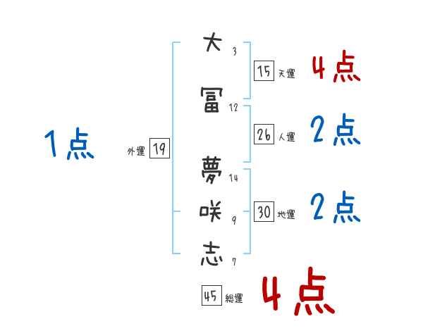 総運![]() | 大冨夢咲志さんの総運は45画の4つ星!もくもくと物事を進め達成する。地味な努力家。 あなたの人生を表す1番重要な運勢です。生涯を通じて影響する総合運となり、主に50歳以降の晩年期に影響を及ぼします。 |