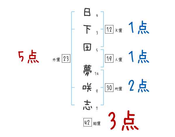 総運![]() | 日下田夢咲志さんの総運は42画の3つ星!病気に注意。多芸であるが消極的でおとなしい。 あなたの人生を表す1番重要な運勢です。生涯を通じて影響する総合運となり、主に50歳以降の晩年期に影響を及ぼします。 |