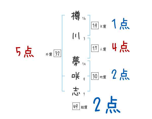 外運![]() | 樽川夢咲志さんの外運は32画の5つ星!柔軟性があり成功する。チャンスが多く金運が良い。 生活面を象徴する運勢です。外部から受ける影響力を表し、結婚運、家庭運や職場、環境への順応性を表します。 |