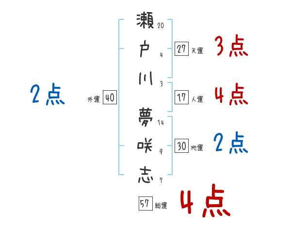 総運![]() | 瀬戸川夢咲志さんの総運は57画の4つ星!向上心があり人望がある。地位を得る。 あなたの人生を表す1番重要な運勢です。生涯を通じて影響する総合運となり、主に50歳以降の晩年期に影響を及ぼします。 |