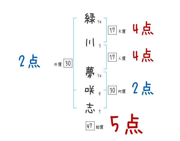 総運![]() | 緑川夢咲志さんの総運は47画の5つ星!実力が開花し発展する円満な人生。財に恵まれる。 あなたの人生を表す1番重要な運勢です。生涯を通じて影響する総合運となり、主に50歳以降の晩年期に影響を及ぼします。 |