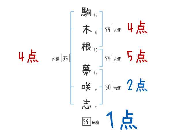 外運![]() | 駒木根夢咲志さんの外運は35画の4つ星!温厚な性格で感受性が高い。穏和な性格で人望が厚い。 生活面を象徴する運勢です。外部から受ける影響力を表し、結婚運、家庭運や職場、環境への順応性を表します。 |