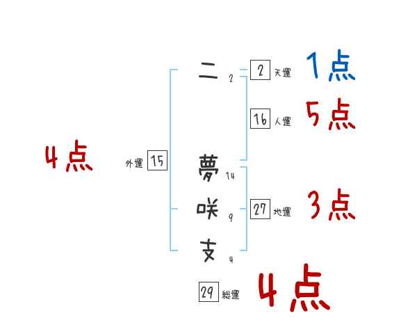 人運![]() | 二夢咲支さんの人運は16画の5つ星!人望が厚く大きく発展する。逆転成功が見える。 性格や才能などを表す2番目に重要な運勢です。人間関係や協調性、社会的な成功に影響します。主に20歳から50歳ぐらいまでの中年期の運勢を表します。 |