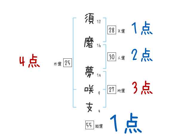 天運![]() | 須磨夢咲支さんの天運は28画の1つ星!家庭環境に注意。スポーツで活躍できる能力があるかも。 家系が持つ宿命的な運勢を表します。祖先から受け継いだ苗字ですので自分の力が及びません。家柄を象徴します。 |