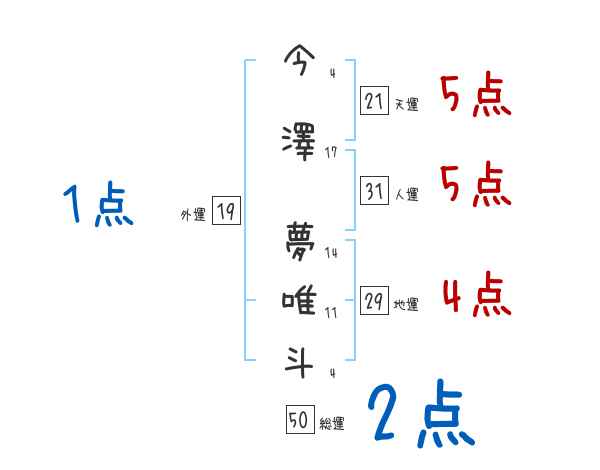 外運![]() | 今澤夢唯斗さんの外運は19画の1つ星!優れた才能を持ちますが、協調性が足りないことも。周りの人と協力する事を意識しましょう。 生活面を象徴する運勢です。外部から受ける影響力を表し、結婚運、家庭運や職場、環境への順応性を表します。 |