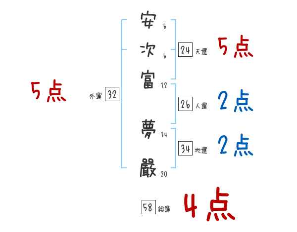天運![]() | 安次富夢嚴さんの天運は24画の5つ星!家庭運が良く順調な人生。金運にも恵まれる。 家系が持つ宿命的な運勢を表します。祖先から受け継いだ苗字ですので自分の力が及びません。家柄を象徴します。 |