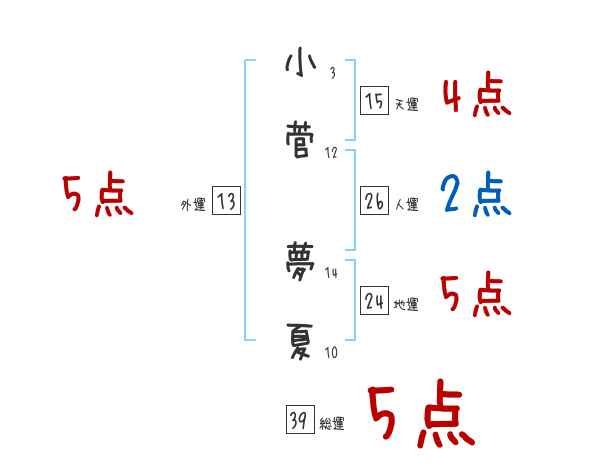 総運![]() | 小菅夢夏さんの総運は39画の5つ星!社交性に優れ人望が厚い。人の上に立ち成功する。 あなたの人生を表す1番重要な運勢です。生涯を通じて影響する総合運となり、主に50歳以降の晩年期に影響を及ぼします。 |