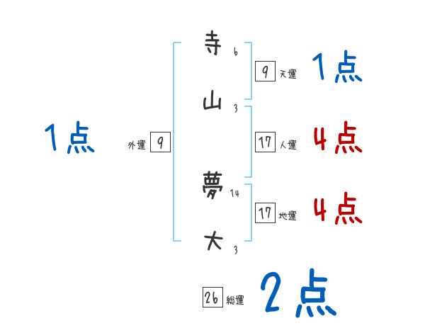天運![]() | 寺山夢大さんの天運は9画の1つ星!消極的で才能を発揮することが苦手なことも。周りの意見に耳を傾けましょう。 家系が持つ宿命的な運勢を表します。祖先から受け継いだ苗字ですので自分の力が及びません。家柄を象徴します。 |